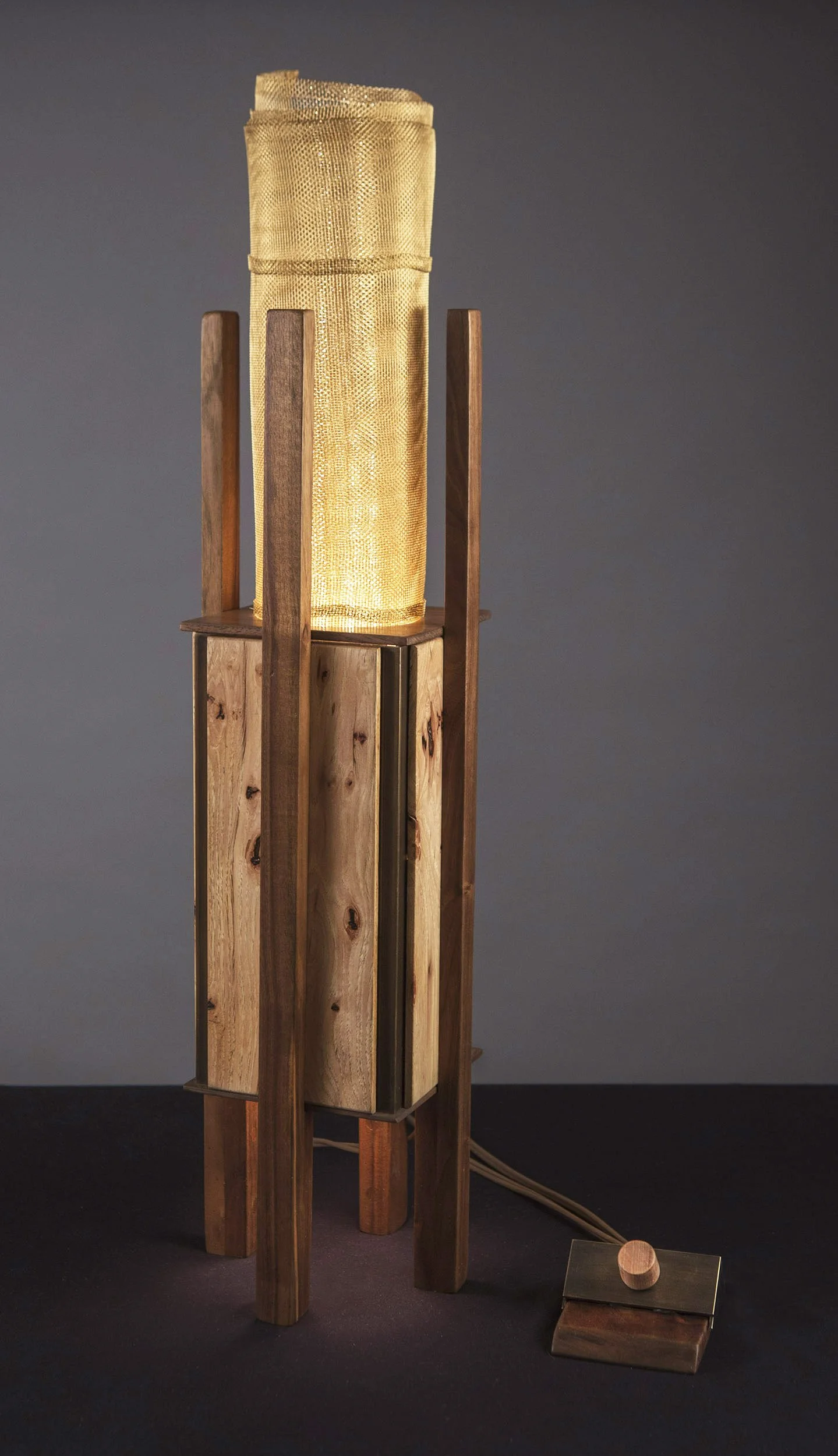 This was another lamp that went through several design changes before it got to what you see here. I had four pieces of beautiful hickory I wanted to incorporate into a lamp. I eventually landed on this design. I slotted the two long edges, of all four boards, to fit oxidized, brass, angles for the corners. I used four walnut sticks, running up the middle of each side, for the legs. There was a thin walnut cap, top and bottom. The top cap had a round hole for the screen roll to fit through. The bronze screen has hemmed edges and is sewn, with long strands of bronze wire, from the same roll. That insures it will hold its shape, top to bottom. The top cap lifts off, with the screen in tact, to change the bulb. The full range dimmer is housed in a custom switch box that sits next to the lamp on the table top. The light, deep in the box, shines up through the the screen and out a round hole in the bottom cap. The lamp is approximately 36" tall x 10" square.